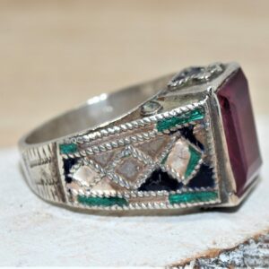 Di particolare rilievo in questi anelli sono la decorazione della fascia, gli smalti (quasi scomparsi) e il castone. In questo pezzo troviamo un bellissimo colore rosso rubino, uno dei colori più simbolici in Oriente insieme al verde.