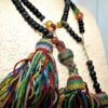 Prezioso rosario Tuareg unico, realizzato in legno di Ebano, con perle in vetro e terminali in lana colorata.