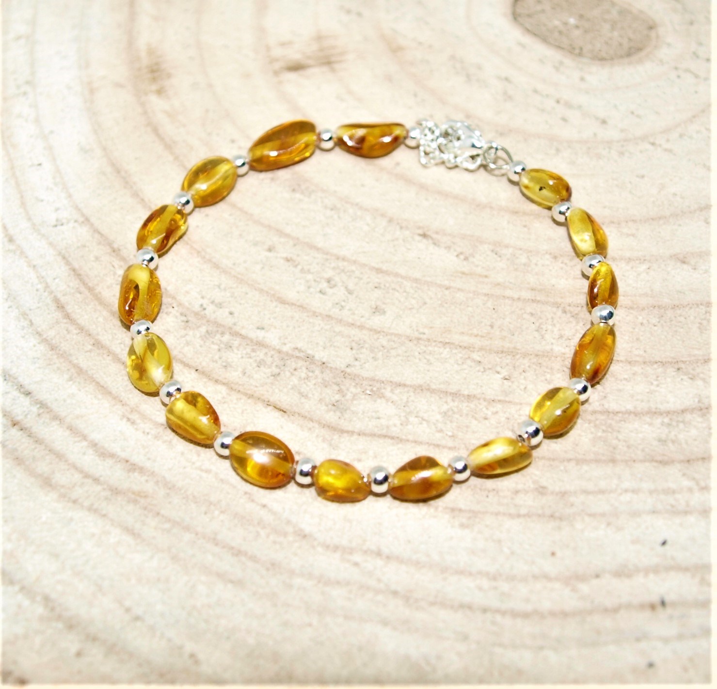 Elegante pulsera en Ámbar natural, hecho a mano con cantos irregulares y con el colore típico del Ámbar en su forma original.
