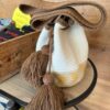 Modelo de  tamaño mini, este bolso presenta una decoración geométrica tradicional en dorado sobre fondo beige, mientras el resto del bolso se ha dejado en blanco, a contraste con el Asa an color chocolate